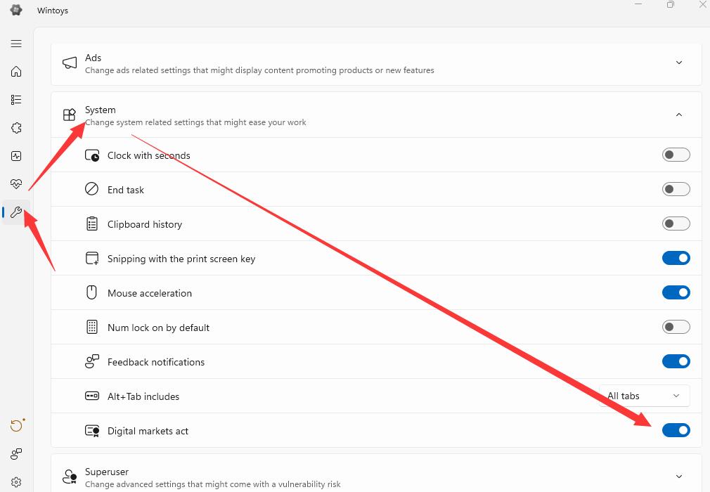 点击小扳手 -system, 选择下面的Digital markets act, 然后重启电脑